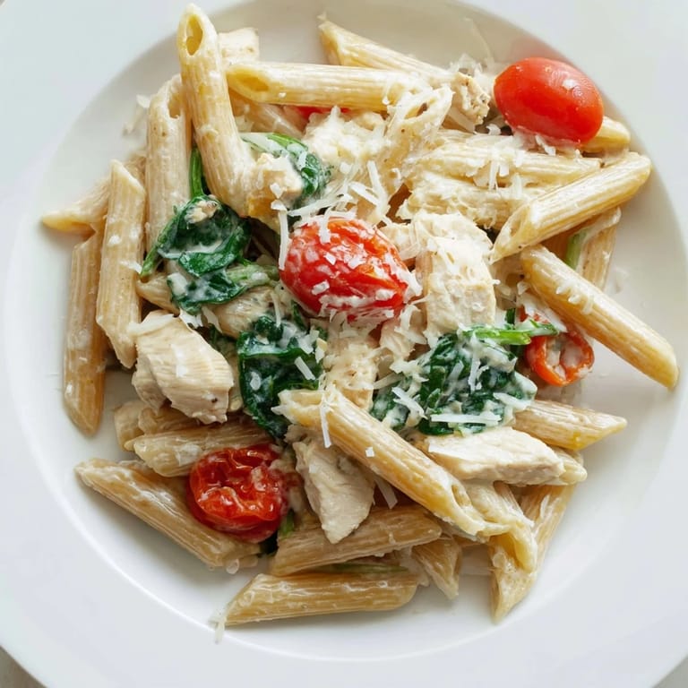 I've thrown in steamed broccoli florets when I needed more greens, and I've swapped the chicken for cooked chickpeas when my vegetarian friends came over. Both versions were devoured. You can also use any short pasta shape you have on hand, though the ones with ridges or twists really do hold the sauce better. If you're gluten-free, this works beautifully with gluten-free penne, and if you want a little heat, a pinch of red pepper flakes in with the garlic changes the whole vibe.