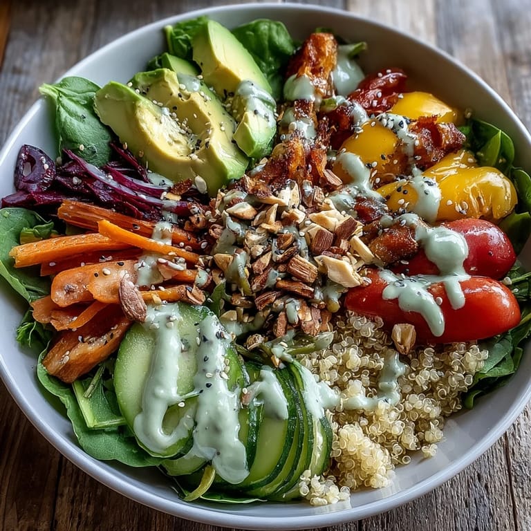 The foundation of fluffy quinoa provides a nutty base for a medley of crisp vegetables like julienned carrots, red cabbage, and fresh baby spinach. Topped with a velvety tahini dressing and crunchy seeds, this bowl offers a balanced meal that is as energizing as it is delicious.
